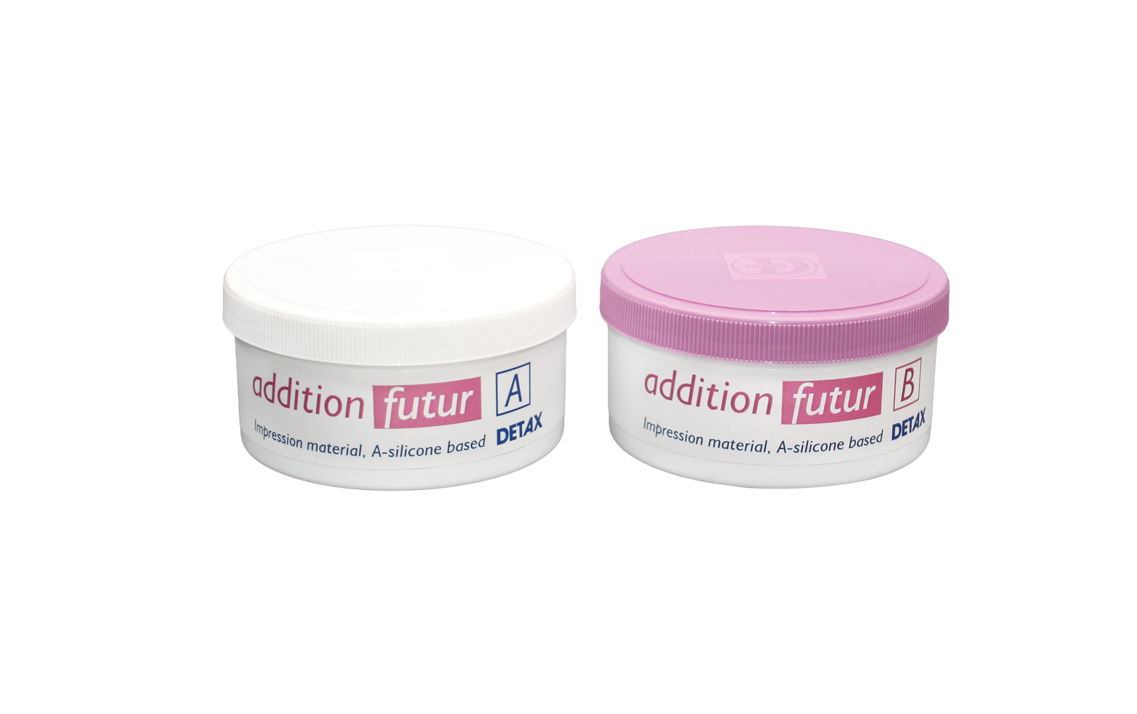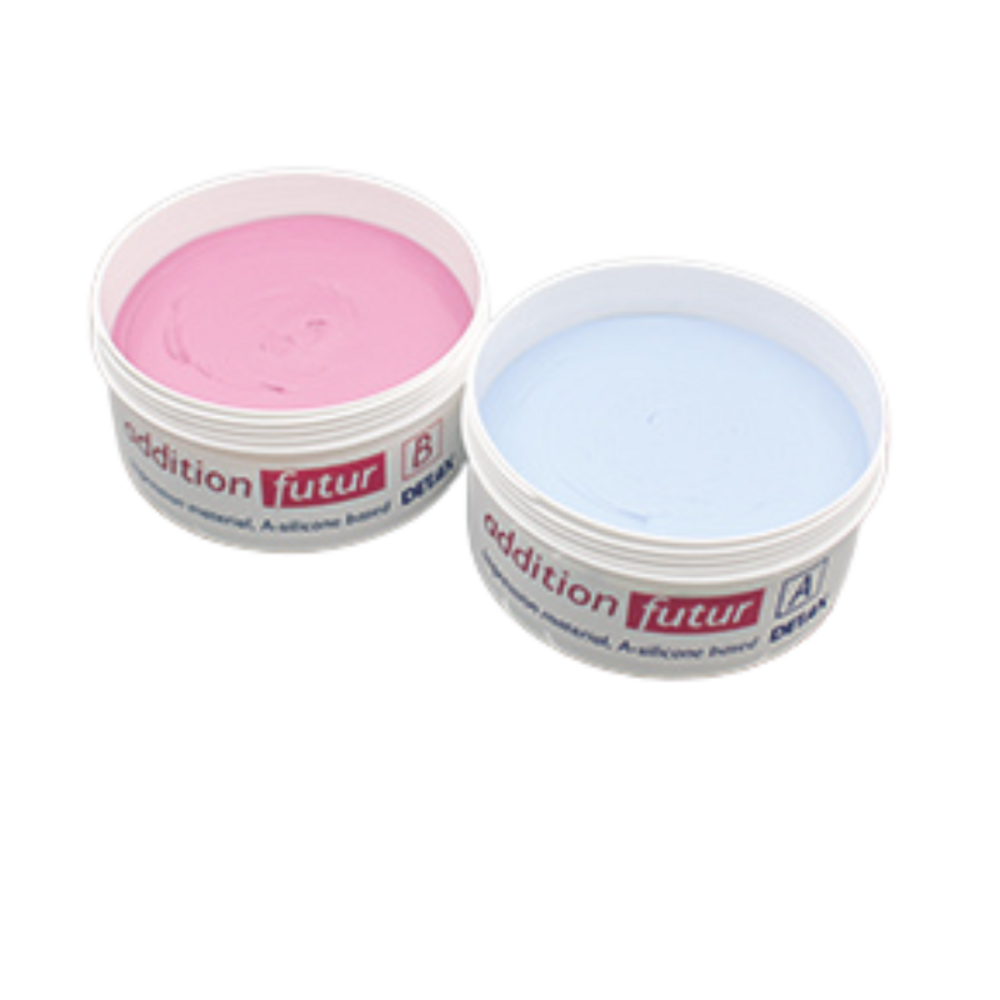 Addition curing ear impression material, excellent cost / performance ratio. Maximum softness & homogeneity, pressure-forming, non-sticky. High detail reproduction, tear- and tensile strength, dimensionally stable. Easy removal and mixing: mixing ratio 1:1 optimum mixing control by contrast colours. Final hardness: approx. 25 Shore A, Color: violet. A-silicone, biocompatible, time in the ear: 3:30 min., scent: lemon. MDR certified, Medical Device Class IIa.