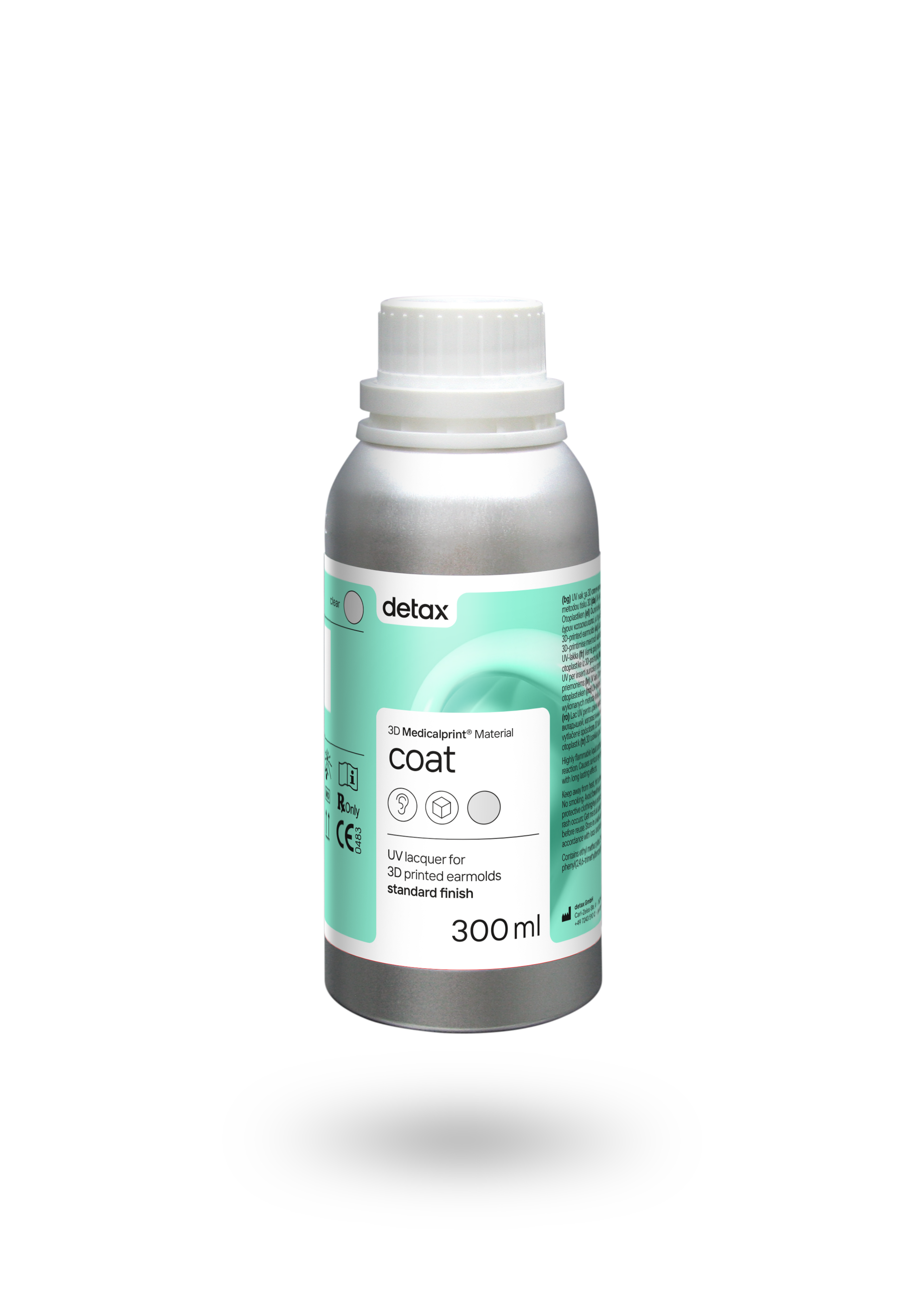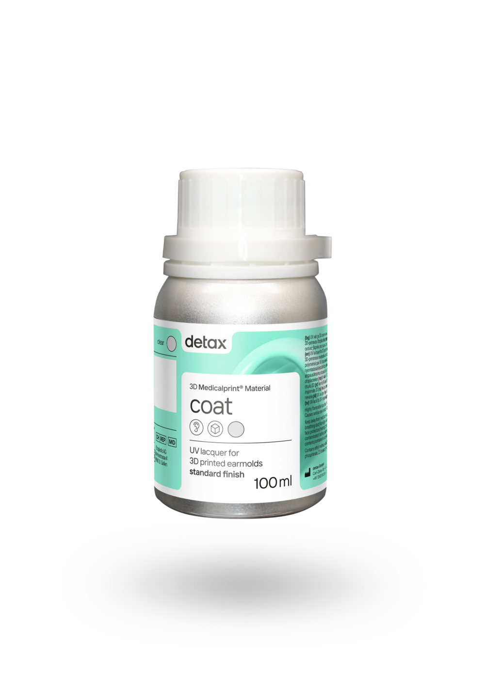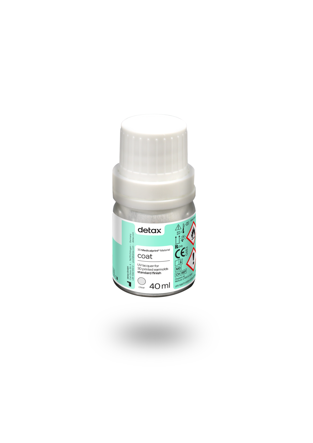 Der lichthärtende, Ein-Komponentenlack zur dauerhaften Oberflächenversiegelung von dx nobreak-Otoplastiken ist transparent, biokompatibel, THF-MA-frei und MDR zertifiziert (Medizinprodukt Klasse IIa).