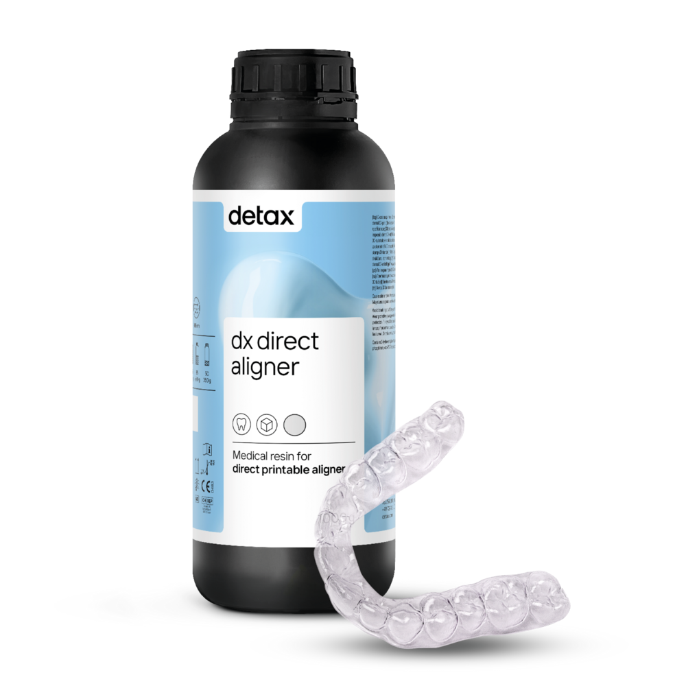 MDR-certified, light-curing resin for the direct 3D printing of aligners and retainers. The material is characterized by outstanding biocompatibility and an optimal balance of strength and flexibility. Its high transparency allows for nearly invisible aligners, while the low water absorption ensures long-term color stability, maintaining transparency over time. dx direct aligner enables a streamlined, efficient workflow and is compatible with standard 3D printing processes. No additional steps are required. Treatment can begin at the first patient contact. Flexible and controlled process steps lead to shorter treatment times. Benefit from custom-fit aligners that are adapted to the individual tooth geometry and enable efficient and controlled tooth movements. Color: clear